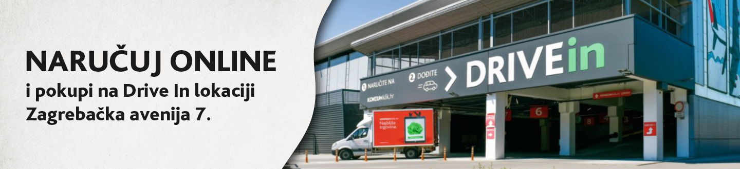 DRIVE in je usluga Konzum online kupnje kojom naručujete i samostalno preuzimate namirnice i kućanske potrepštine. Jednostavno je – naručite namirnice na Konzum.hr i odaberite termin koji vam odgovara. Možete naručiti bilo gdje. Primjerice - naručite na računalu na poslu, a namirnice preuzmite kad idete prema domu.
