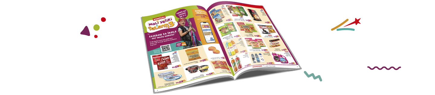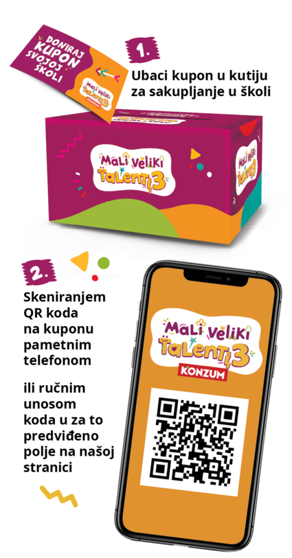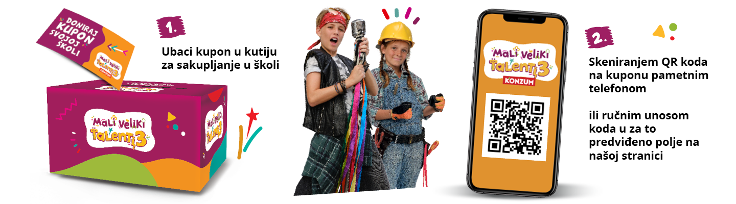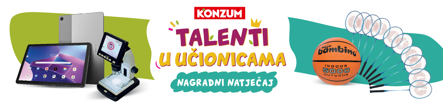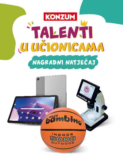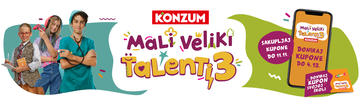 Od 3.9. do 11.11.2025. za svakih potrošenih 10 eura i/ili za kupnju odabranih proizvoda u svim Konzum prodavaonicama dobivaš JEDAN kupon Mali veliki talenti 3.