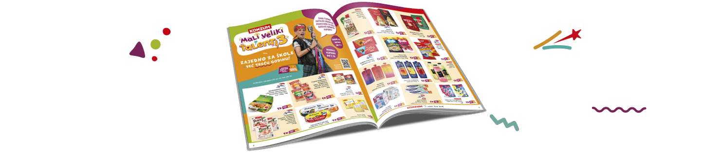Od 3.9. do 11.11.2025. za svakih potrošenih 10 eura i/ili za kupnju odabranih proizvoda u svim Konzum prodavaonicama dobivaš JEDAN kupon Mali veliki talenti 3.