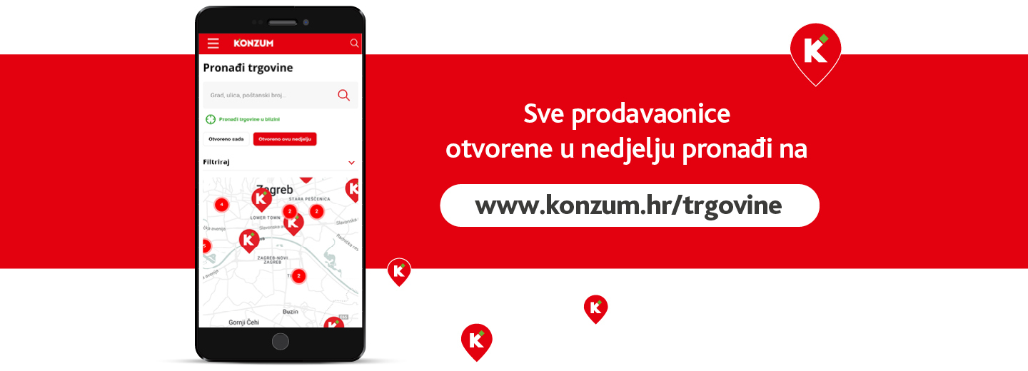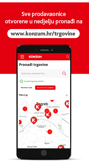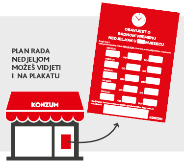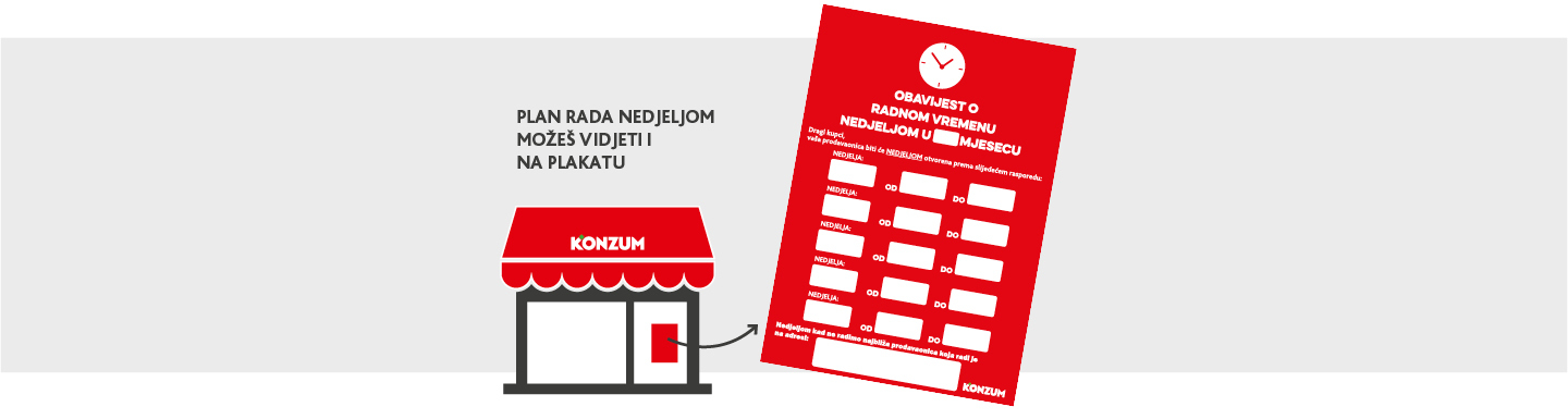 Raspored rada nedjeljom možete vidjeti i na plakatu ulaznih vrata svake naše prodavaonice kao i drugu najbližu Konzum prodavaonicu u slučaju da prodavaonica koju posjećujete ne radi.