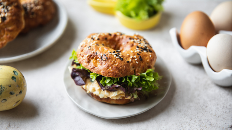Za to vrijeme pripremite salatu od jaja. Jaja ogulite i nasjeckajte na sitne komade. Dodajte im sitno sjeckani mladi luk i nasjeckane kisele krastavce. Dodajte posni sir, senf, sol i limunov sok te dobro promiješajte. Salatu kratko ohladite u hladnjaku, zatim njome napunite proteinske bagele. U bagele možete dodati i listove zelene salate.