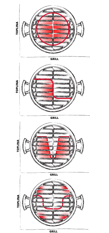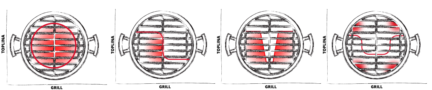 3. PARALELNI - ugljen je potrebno zagrijati na bočnim dijelovima roštilja. Idealno za veće komade mesa, cijelu piletinu ili puretinu.