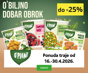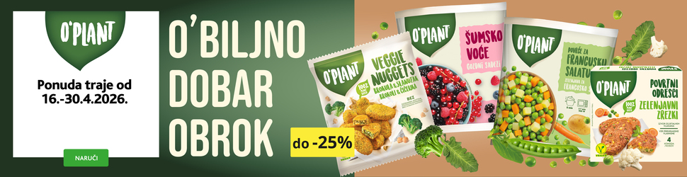 AKCIJA -25% ! O'Plant Povrtni odresci 400 g Cijena za j.m.: 6,35 €/kg NC 30 dana: 3,39 €/kom Vrijedi do: 30.04.2026 Cijena 02.05.2025.: 3,39 €/kom (15) 2 54 €/kom kom